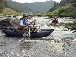 Cowpie (also known as Houserock)- This long rapid begins some time after crossing into Wyoming. The rapid begins after a leisurely right turn in the river and the gradient noticeably increases. Also, a large outcrop of granite on river-left that resembles a cowpie marks the entrance. At the first corner (a left turn) a particular maneuver is required to pass an obstacle known as Split Rock (also known as Cowpie Rock). This is generally navigated on river right with a hard pull back to the left. Proper navigation of Split Rock allows for the ideal set up for the remainder of the rapid. The flow is obstructed by several large boulders and the current weaves from bank to bank. Once the river narrows into a sheer-walled canyon, Cowpie is over and Narrow Falls has arrived. There is no gap between Cowpie and Narrow Falls. The two rapids flow seamlessly into one another. A mistake in Cowpie could prove disastrous in the Falls.