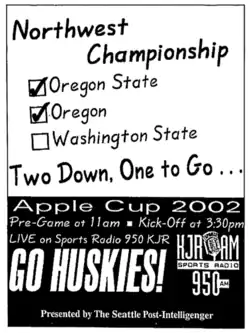 - ^ a b c d Condotta, Bob (October 12, 2004). "Huskies eyeing mythical Northwest title". The Seattle Times. Retrieved January 8, 2022.
