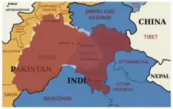 Northwest India borders Pakistan to the west, and the Tibet Autonomous Region and Xinjiang of China to the northeast.[c] Before the Partition of India, the term "Northwest India" included the entirety of Punjab, Sindh[9] and North West Frontier Province, in addition to the territory of modern-day India west of the 77th meridian east and north of the 24th parallel north.[10]