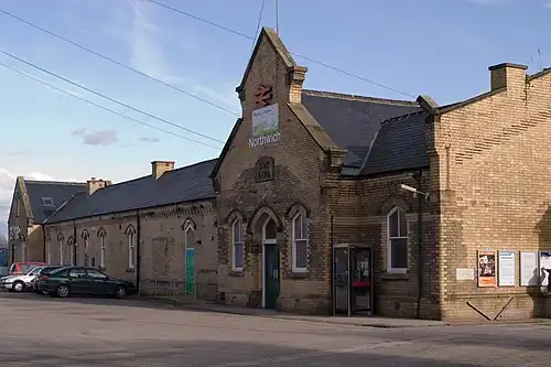The station expanded as the railway grew and by 1910 there were three platform faces, a bay for loading cattle, extensive goods sidings with a five-ton crane and a goods station.[4][5][6] The CMR built a two-lane engine shed and turntable in 1869, the shed was doubled in size in 1877 and rebuilt around 1948 before closing to steam engines in 1968 and diesel in 1982.[4][7]