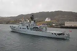 After the end of the war, the fisheries surveillance services were reorganized. A number of whaling ships which had participated in the Arctic convoys were put into use as surveillance vessels while the navy focused on minesweeping.[57] The surveillance was supplemented with Flower-class corvettes. Three used River-class frigates were taken into use in 1956,[58] allowing Nordkapp to be decommissioned in 1956 and Senja two years later.[56] The corvettes and later the frigates were used both for fisheries inspection and held in readiness for war. They, therefore, incurred high operational costs, were inefficient and had a large degree of conscripts.[59]