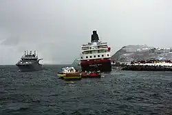 NoCGV Harstad (W318) is primarily designed as a tow boat. It is well equipped to handle oil spills and is designed to handle both deep-submergence rescue vehicle and remotely controlled vehicles. It is equipped with a Bofors 40 mm gun. Harstad has a displacement of 3,130 tonnes, a length 83 meters (272 ft) and a crew of 22. It has an exceptional range and is used to refuel the outposts on Jan Mayen, Bjørnøya and Hopen.[38]