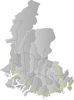 Norwegian County Road 456 (Fv456) is a Norwegian county road in Agder, Norway. The road takes over for European route E39 in Hannevika, Kristiansand, in to the borough Vågsbygd. Therefore this part is called the Vågsbygdporten and goes through a tunnel under Slettheia. The road continues south through Vågsbygd and goes west when it comes to Voiebyen. It then goes past Bråvann and into Søgne municipality. In Søgne, the road goes through Langenes and is therefore called Langenesveien or Langenessletta. County Road 456 goes past places like the church in Søgne and the only high school in Søgne. The road ends in Søgne centrum, Tangvall. It leads through the centre and stops with E39 again. [1]