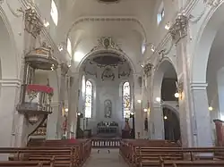 This Romanesque church dates back to the early 12th century[2] and is located next to the Zaehringen Bridge. It is thus the oldest church in the city. Significant work took place between 1467 and 1525, including the addition of a spire to the bell tower and the reconstruction of the pentagonal chancel with a semi-circular apse. Saint Peter Canisius founded the Congregation of the Virgin here. The church was granted the title of collegiate church in 1728 (affiliated with the Basilica of Saint John Lateran), and its clergy became canons. The church belonged to the Bourgeois Hospital for a long time before being transferred to the diocese in 1884[3]. The neoclassical façade was built between 1785 and 1787, and the new spire and interior decoration date from this period. In recent decades, the church was at risk of collapse due to neglect. Restoration work ultimately saved it. The Notre-Dame Basilica Foundation, established in 1968 and which became its owner, now ensures its preservation. It was fully restored between 1990 and 2011.