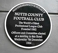 Notts County Football Club is a professional football club in Nottingham, England, which competes in EFL League Two, the fourth tier of English football, following promotion from the National League in the 2022–23 season. Founded in 1862, Notts County are the oldest professional football club in the world.[1][2][3] They first competed in the FA Cup in 1877 and in 1888 became one of the twelve founding members of the Football League. Notts County have been promoted fourteen times, relegated seventeen times and have played in each of the top five divisions of English football.