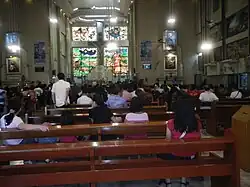 The church is an architectural landmark in the area, with a striking facade consisting of tubular structures joined together to form a roof. The ascension chapel is to the left of the altar and is usually used for wakes and necrological services. A basement area is used for Parish Renewal Experience meetings and also holds choir records. The altar area was expanded and renovated in 2007 and features Art Deco ornamentation, a first in the Philippines. The crypt and sanctuary was also improved and expanded in the same year. Air-conditioning was installed in 2008. The Msgr. Fidelis Limcaco Hall is right beside the church and hosts concerts, receptions, and weekend markets. On the second floor of the Msgr. Fidelis Limcaco Hall are the Pastoral Offices of the Diocese of Novaliches. Limcaco commissioned the altar-tabernacle crafted by Eduardo Mutuc's pukpuk pilak.[1]