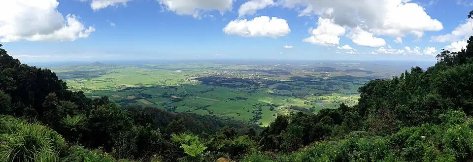 Nowra possesses a humid subtropical climate (Köppen: Cfa), with very warm, wet summers and mild, relatively dry winters. Compared with nearby Wollongong and Kiama which have an oceanic climate, Nowra has slightly warmer summers due to its inland location, thus qualifying it as humid subtropical climate.[12] Average maxima vary from 27.6 °C (81.7 °F) in January to 16.8 °C (62.2 °F) in July, while average minima fluctuate between 16.8 °C (62.2 °F) in January and 6.8 °C (44.2 °F) in July. Annual precipitation is moderately high (averaging 1,026.1 mm (40.40 in)), and is spread across 86.7 precipitation days (over 1.0 mm (0.039 in)). Due to its position on the leeward side of the Great Dividing Range, Nowra experiences a foehn effect, particularly in late winter and spring.[13] The town experiences 99.6 clear days and 127.4 cloudy days per annum.[14] Extreme temperatures have ranged from 45.6 °C (114.1 °F) on 21 December 2019 to −0.9 °C (30.4 °F) on 24 August 2002.[15]