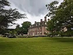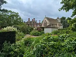 Also in the gardens is an unusual vernacular carved stone, possibly of the 19th century, topped by a 14th-century finial.[15] In the corner of the garden is an early-18th century pavilion, built of brick, with an ogee-shaped lead roof.[16]