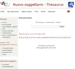 The Nuovo soggettario is a subject indexing system managed and implemented by the National Central Library of Florence (Biblioteca nazionale centrale di Firenze, BNCF), that in Italy has the institutional task to curate and develop the subject indexing tools, as national book archive and as bibliographic production agency of the Bibliografia nazionale italiana.[1] It can be used in libraries, archives, media libraries, documentation centers and other institutes of the cultural heritage to index resources of various nature (texts, images, sounds, web sites, etc.) on various supports (analog, digital).