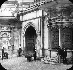 Detail of Baroque carving above the prayer hall's courtyard entrance, replacing the traditional muqarnas -