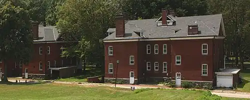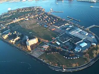 After the war, Castle Williams was used as a military stockade and became the East Coast counterpart to military prisons at Fort Leavenworth, Kansas, and Alcatraz Island, California.[22] Infrastructure and facilities were repaired, unused structures were destroyed, and in 1875 a new munitions warehouse was built north of Fort Columbus.[80] Significant development occurred on the formerly undeveloped northern and eastern sides of the island: the old wood-frame barracks outside Fort Columbus were replaced, and new officers' quarters were built in Nolan Park, east of Fort Columbus.[81] The seawalls on the north and west sides of the island were rehabilitated or extended to create additional buildable land.[82] During this period of expansion, in 1870, a particularly severe yellow fever epidemic occurred on the island, sickening hundreds and requiring a quarantine.[79][83][84] The structures that hosted yellow fever patients were later demolished.[83] Despite these changes, in 1873 Fort Columbus and Castle Williams were still described as operable.[85]