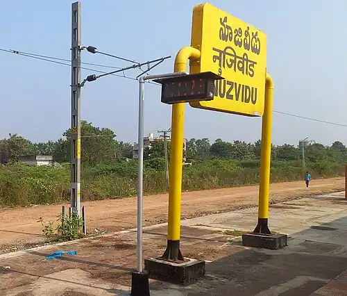 Nuzvid railway station (station code:NZD)[1] is the railway station under the jurisdiction of Indian Railways. It serves Hanuman Junction and Nuzvid town situated in the Krishna district of Andhra Pradesh. Nuzvid railway station falls under Vijayawada railway division of South Central Railway zone. It is situated on the Howrah–Chennai main line.[2][3][4] It is one of the 27 rural stations in the state to have Wi-Fi.[5]