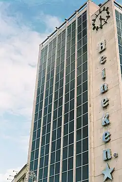 A 12-storey concrete and glass tower faced in Portland stone designed by Desmond FitzGerald.[8] On its north face is a clock and a large advertising space; it has in the past bore the names of Guinness and Sony, and now holds Heineken.[9] At the time it was first opened, the lease on the Guinness sign took in more revenue than all the office space. The construction took 500 tons of structural steel, 90 tons of steel-reinforcing bars, and 7500 tons of concrete. Upon completion, it was 145 feet tall. It contains 45000 square feet of office space, but no car parking. The planning laws requiring one car parking space per 500 square feet of office space were waived for this development. The original plan was to build a matching block on the opposite side of the river, on the site of the Ballast Office, but planning permission for this was rejected.[6]