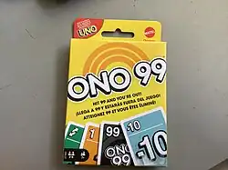 ONO 99 (previously published as O'NO 99 by International Games, Inc.) is a proprietary card game produced by Mattel and based on the public-domain card game Ninety-nine (addition card game), but played with a unique deck of 54 cards (112 cards in the 2022 edition). The object of the game is to play as many number cards as possible while keeping the total value of discarded cards below 99. Similar to the game UNO, ONO 99 has special cards such as Reverse, Hold, and Double Play cards that can alter gameplay.