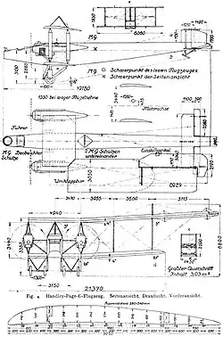 Handley Page suggested a land-based aircraft of similar size, and a specification drawn up around his suggestions was formally issued on 28 December 1914 for four prototypes. It called for a large biplane powered by two 150 hp (110 kW) Sunbeam engines, which was required to fit in a 75 ft × 75 ft (23 m × 23 m) hangar and would therefore have folding wings. It was to carry six 100 lb (45 kg) bombs and have armour to protect crew and engines.[4] The crew of two were to be enclosed in a glazed cockpit and the only defensive armament planned was a rifle for the observer/engineer. The designation O/100 came from Handley Page's sequence of using letters for each of their designs, with 100 for the proposed wingspan of the aircraft.[5] The design was approved on 4 February 1915, with 250 hp (190 kW) Rolls-Royce Eagle engines and on 9 February the contract was amended to include eight additional aircraft.[6]