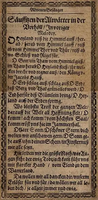 - ^ Schell, Johanna (2001). "O Heiland reiß die Himmel auf". In Hahn, Gerhard; Henkys, Jürgen (eds.). Liederkunde zum Evangelischen Gesangbuch (in German). Göttingen: Vandenhoeck & Ruprecht. pp. 3–5. ISBN 9783525503218.