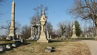 Oak Hill Cemetery traces its roots to 12 August 1850, when the Evansville City Council appointed a committee to search for a new cemetery to replace the first public burying grounds located on the southeast edge of town at Mulberry and Fifth Streets.[2] Within two years they selected a plot of land, then known as "Lost Hill," which was 56-acres of undeveloped land about a mile and half from the then city limits.[3] By February 1853 lots were offered for sale.