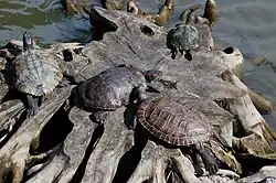 ![]() Turtles sun themselves on a stump near the park's pond. | |