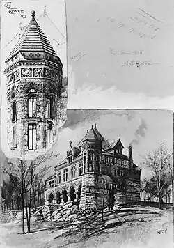 The structure's main facade, altogether 96 feet (29 m) long by 51 feet (16 m) deep, presents an arcade of five massive arches with a row of windows set above and an octagonal tower at its right corner. Its first floor is constructed of native, pinkish-gray North Easton granite with Longmeadown brownstone trim. The second floor is brick, with a north-facing dormer half finished in timber and stucco. The steeply peaked roof above is finished in red tile. The front's third-floor, dormer window is wreathed with sculpted foliage, and displays the initials O. A. and twelve signs of the zodiac.