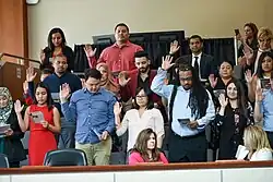 Participants of the citizenship ceremony raise their right hand for the Oath of Citizenship