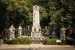 The Obelisco a los Niños Héroes is a monument installed in Chapultepec, Mexico City. The cenotaph was created in 1881 by architect Ramón Rodríguez Arangoity, one of the cadets captured in the Battle of Chapultepec.[1][2] The marble cenotaph was a typical nineteenth-century monument. This one lists the names of the six cadets, the Niños Héroes, killed in the fierce fighting in the Mexican–American War as military cadets defended as well as the 40 who survived the attack. For his own political purposes, General Porfirio Díaz inaugurated the monument with a military and civilian audience of dignitaries. Subsequently, the obelisk became an annual site of remembrance for the Association of the Military College, a group of veterans who had been cadets.[3] This modest-sized monument was superseded in 1952 by the massive Monumento a los Niños Héroes.