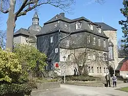 In 1888 the city of Siegen bought the Obere Schloss from the Kingdom of Prussia for 30,400 marks[3] and established the Siegerlandmuseum of regional history there in 1905.[4] It was inaugurated on 25 March 1905.[5] Its mission was stated to be to "present the essence of the Siegerland homeland in terms of history, culture and folklore". It had only three exhibition rooms in the Schloss, but this had been expanded to 35 rooms by 1929 and it now has 1.500 m² of display space.[6] On 8 July[a] 1938, a 150-metre-long 14-metre-deep show mine opened under the castle courtyard to demonstrate the original facilities and equipment of a Siegerland mine.[7][6][8]