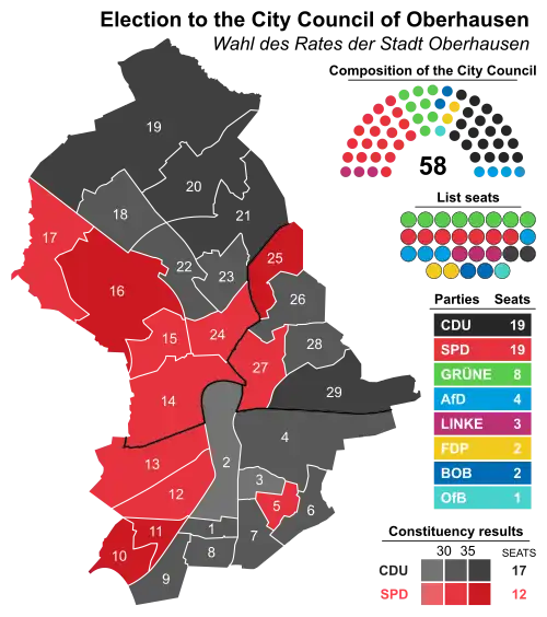 The Oberhausen city council governs the city alongside the mayor. The most recent city council election was held on 13 September 2020, and the results were as follows: