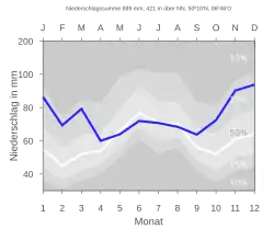 Yearly precipitation in Oberstadtfeld amounts to 890 mm, falling into the highest fourth of the precipitation chart for all Germany. The driest month is April. The most rainfall comes in December. In that month, precipitation is 1.6 times what it is in April.