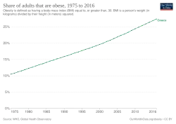 According to Forbes, Greece ranks 16 on a 2007 list of fattiest countries with a percentage of 65.5% of its citizens with an unhealthy weight.[1] This may be a surprise to most individuals because in the past Mediterranean countries like Greece were known to live a pretty healthy lifestyle. The Mediterranean diet was developed based on the food patterns in these different countries, Greece being a main one.[2] In the past the people of Greece consumed a diet consisting mainly of fish, fruit, vegetable, and wine, limiting meats. These countries also were fairly active which helps to keep them healthy.