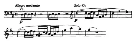 As with his other late works, Strauss builds up the music from a series of small melodic ideas "which are the point of departure for the development of the entire composition."[13] The concerto is built up from three main thematic elements. The first is the 4 semiquavers D–E–D–E which opens the piece in the cellos. The second is a long note (minim) followed a playful figure of shorter durational values (semi-quavers). The third is a repetition short-short-short long followed by different variants of continuations. This motif echoes the rhythm of the Fate motif of Beethoven's Fifth symphony and "clearly refers to Metamorphosen, completed just before the Oboe Concerto – a remarkable example of the thematic links between the last instrumental works".[14] However, it also relates back to Strauss's use of the rhythm of the Fate motif in the first movement of his youthful Piano Sonata written over 60 years earlier in 1881. The finale ends with a surprise: after the second cadenza, Strauss concludes with a dance-like Allegro in 6/8 meter which comes across as a fourth movement with a character of its own.