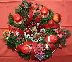 Christmas traditions for many nations include the installing and lighting of Christmas trees, the hanging of Advent wreaths, Christmas stockings, candy canes, setting out cookies and milk, the creation of Nativity scenes depicting the birth of Jesus Christ and giving gifts to others.[1] Christmas carols may be sung and stories told about such figures as the Baby Jesus, Saint Nicholas, Santa Claus, Father Christmas, Christkind or Grandfather Frost. The sending and exchange of Christmas card greetings, observance of fasting and special religious observances such as a midnight Mass or Vespers on Christmas Eve, the burning of a Yule log, and the giving and receiving of presents are also common practice. Along with Easter, Christmas is one of the most important periods on the Christian calendar, and is often closely connected to other holidays at this time of year, such as Advent, the Feast of the Immaculate Conception, Saint Nicholas Day, Saint Stephen's Day, New Year's, and the Feast of the Epiphany.[2]