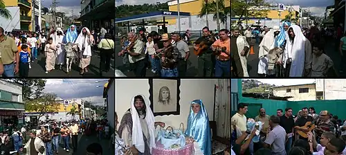 16 December is the first day of the Christmas Novena, a devotion consisting of prayer said on nine successive days, the last one held on Christmas Eve. The Novena is promoted by the Catholic Church as a staple of Christmas, and is very similar to the posadas celebrated in Mexico. It is a call for an understanding of the religious meaning of Christmas, and a way to counter the commercialism of the Christmas season. Individual traditions concerning the Novena may vary, but most families set up a pesebre (manger scene), sing religious Christmas carols called villancicos accompanied by tambourines, bells, and other simple percussion instruments, and read verses from the Bible as well as an interpretation which may change from year to year. Novenas serve as religious gatherings as well as learning environments for young children since kids have a central and active role in the celebration of the Novenas (they read prayers, sing, and play instruments guided by their family). From 16 to 24 December, games called aguinaldos[41] are played after having made a "pinky promise" deciding the prize for the winner and the punishment for the loser. The games include Hablar y no contestar ('Talk but don't answer'), Dé pero no reciben ('Give but don't receive'), Pajita en boca ('Straw in the mouth'), Tres pies ('Three feet'), Beso robado ('Stolen kisses'), and Si y al no ('Yes or no'). Churches offer dawn and nightly masses during the nine days of the novena, culminating with the Misa de Gallo ('Rooster's Mass') on Christmas Eve at midnight.