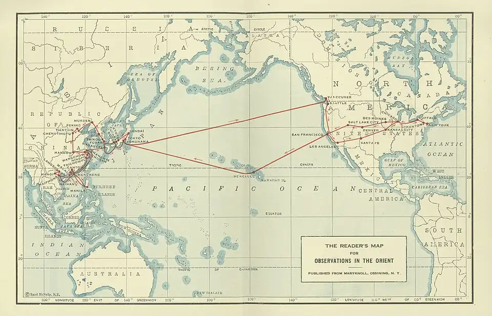 5. ^ a b c d e f Walsh, James Anthony (1919). Observation in the Orient: The Account of a Journey to Catholic Mission Fields in Japan, Korea, Manchuria, China, Indo-China, and the Philippines. Ossining, New York: Catholic Foreign Mission Society of America. pp. vii.