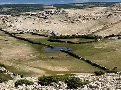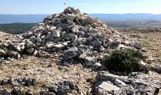 It lies in the middle of a Karst plateau in the south-eastern part of the island and is marked by a stone-pile, with points of similar height Veli Vrh and Vrska Glava to east and west.