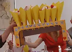 The Danish lejlighedssang remains a strong tradition,[2] part of family celebrations, particularly during confirmation, wedding and anniversary parties. Participants write lyrics for the specific occasion composed upon a popular tune. Copies of the lyrics are written on decorative pages and distributed among the celebrants to be read and sung en masse. The tradition in Denmark dates back to the street ballads and political club songs of the late 1700s.[3] Group singing became further integrated across Danish society by the influence of N. F. S. Grundtvig's national consciousness and public school movements in the mid-1800s.[3] By post-World War II, the singing of lejlighedssange at celebrations was typical.[3] According to Danish historians, the lejlighedssang persists in modern Danish culture as an important form of group bonding or fælleskab (togetherness).[2][3]