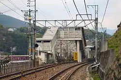 The station has one ground-level island platform connected to the station building by a footbridge. The station is unattended.