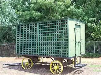 This jail on wheels was one of several used in the early twentieth century for the housing and transport of prisoners on the chain gang. It was built around 1900.[3]