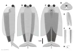 The body ends in a terminal trunk segment which is around 5 times longer than the preceding segment. It is conical in shape, and ends with three fin shaped segments, two projecting sideways (laterally) referred to as caudal rami, while one projects upwards (dorsally). The front (anterior) facing edges of the fins bear spines, and it is possible that the posterior edges of the caudal rami bear setae.[3]
