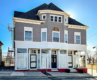 Oddfellows' Hall is a rare surviving element of Watchemoket Square (watch-uh-MOE-ket or watch-uh-MAH-ket[4]), a village which was the heart of the East Providence business community during the late 19th and early 20th centuries.[5][6] East Providence was incorporated in 1862, and Watchemoket Square was significantly built up between 1880 and 1920.[5] It became a desirable location for the professional class to live, and many large Queen Anne and shingle style buildings were built in the neighborhood with decorative towers and porches.[5] An 1885 iron bridge on Warren avenue connected Warren Avenue to India Point in Providence.[7]
