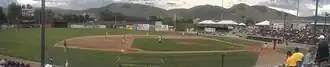 The field dimensions are 309 feet (94 m) down the left field line, 398 feet (121 m) to center field, and 287 feet (87 m) down the right field line, which includes a 27-foot-high (8.2 m) wall. Just south of the Clark Fork River, the natural grass field is aligned northeast (home plate to second base) at an approximate elevation of 3,200 feet (975 m) above sea level.