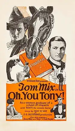 Oh, You Tony! is a 1924 American silent comedy Western film directed by John G. Blystone and written by Donald W. Lee. The film stars Tom Mix, Claire Adams, Dick La Reno, Earle Foxe, Dolores Rousse and Charles K. French. The film was released on September 21, 1924, by Fox Film Corporation.[1][2][3]