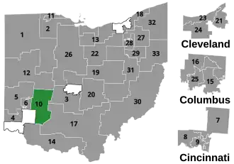 Ohio's 10th senatorial district has been based in south-central Ohio. It comprises the counties of Clark, Greene and Madison. It encompasses Ohio House districts 73, 74 and 79. It has a Cook PVI of R+15. Its current Ohio Senator is Republican Bob Hackett. He resides in Madison County.