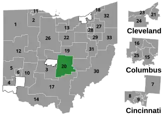 Ohio's 20th senatorial district is based in east-central Ohio. It used to stretch into southeastern Ohio. It is made up of the counties of Fairfield, Hocking, Morgan, Muskingum and Guernsey as well as portions of Pickaway and Athens counties. It encompasses Ohio House of Representatives districts 77, 78 and 97. It has a Cook PVI of R+16. Its Ohio Senator is Republican Tim Schaffer. He resides in Lancaster, a city located in Fairfield County.