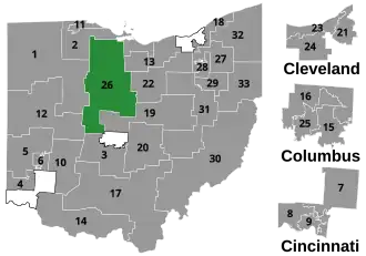 Ohio's 26th senatorial district has always been based in northern central Ohio, and currently comprises the counties of Sandusky, Seneca, Wyandot, Crawford, Morrow, Marion and Union. It encompasses Ohio House districts 86, 87 and 88. It has a Cook PVI of R+21. Its current Ohio Senator is Republican Bill Reineke.