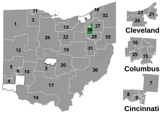 Ohio's 28th senatorial district has historically been based in metro Akron. Currently it consists of a portion of Summit County. It encompasses Ohio House districts 34, 35 and 36. It has a Cook PVI of D+5. Its current Ohio Senator is Democrat Casey Weinstein. He resides in Hudson, a city located in Summit County.