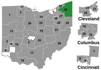 Ohio's 32nd senatorial district has historically been based in the Mahoning Valley. Currently it consists of the counties of Ashtabula and Trumbull as well as portions of Geauga county. It encompasses Ohio House districts 63, 64 and 99. It has a Cook PVI of R+10. Its current Ohio Senator is Republican Sandra O'Brien.