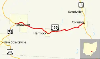 State Route 155 (SR 155) is an east–west state highway in the southeastern portion of the U.S. state of Ohio. The highway's western terminus is at SR 93 in Shawnee. At its midpoint in Hemlock the highway is known as Sanders Street. The highway’s eastern terminus is at a four-way stop intersection with SR 13 in Corning.