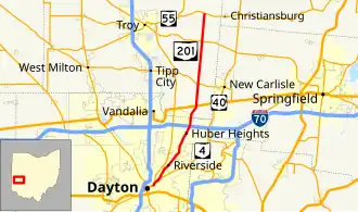 State Route 201 (SR 201) is a 21.69-mile (34.91 km) long north–south state highway in the western portion of the U.S. state of Ohio. The southern terminus of SR 201 is at an interchange with the SR 4 freeway in Dayton. Its northern terminus is at a T-intersection with SR 55 approximately 3.25 miles (5.23 km) east of Casstown.
