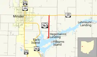 State Route 363 (SR 363) is a short north–south state highway located in west-central Ohio. The southern terminus of this spur route is along the shores of Lake Loramie approximately two and a half miles (4.0 km) southeast of Minster, where the roadway becomes known as Lotus Road. The northern terminus of SR 363 is at a T-intersection with SR 119 about one mile (1.6 km) east of Minster.