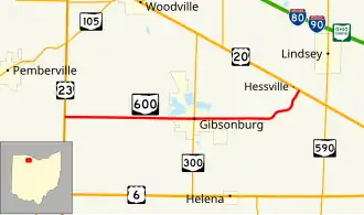 State Route 600 (SR 600) is an east–west state highway in the northwestern portion of the U.S. state of Ohio. The western terminus of State Route 600 is at US 23 about 5 miles (8.0 km) west of Gibsonburg. Its eastern terminus is at US 20 in the unincorporated community of Hessville approximately 4.25 miles (6.84 km) east of Gibsonburg.